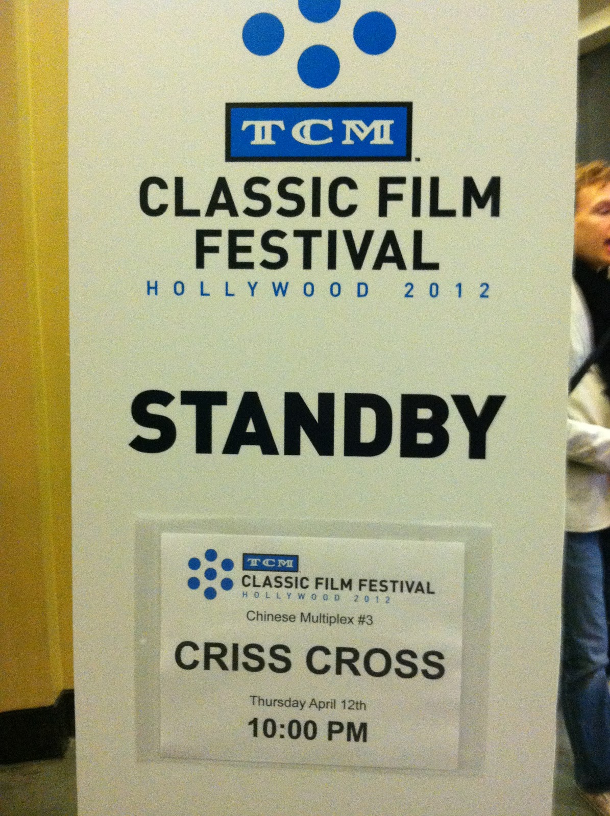 I had a relatively slow workday today, so I decided to take a gamble and drive up to the TCM Classic Film Festival in hopes of getting a standby ticket to a late screening. My hope was to see the Film Noir Foundation's Eddie Muller introduce CRISS CROSS (1949) with Burt Lancaster, Yvonne DeCarlo, and Dan Duryea. It's on my list of 10 classics I particularly want to see in 2012.